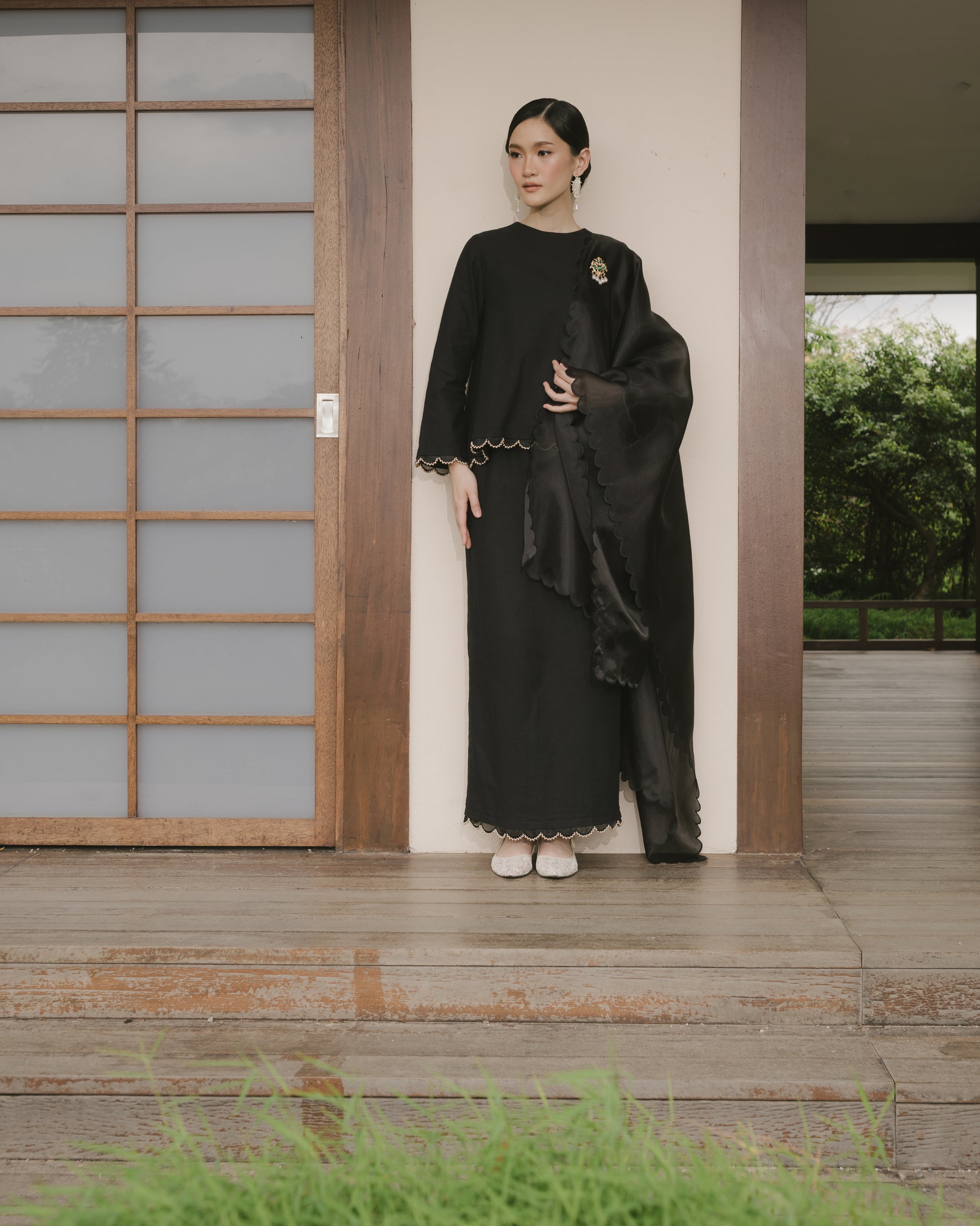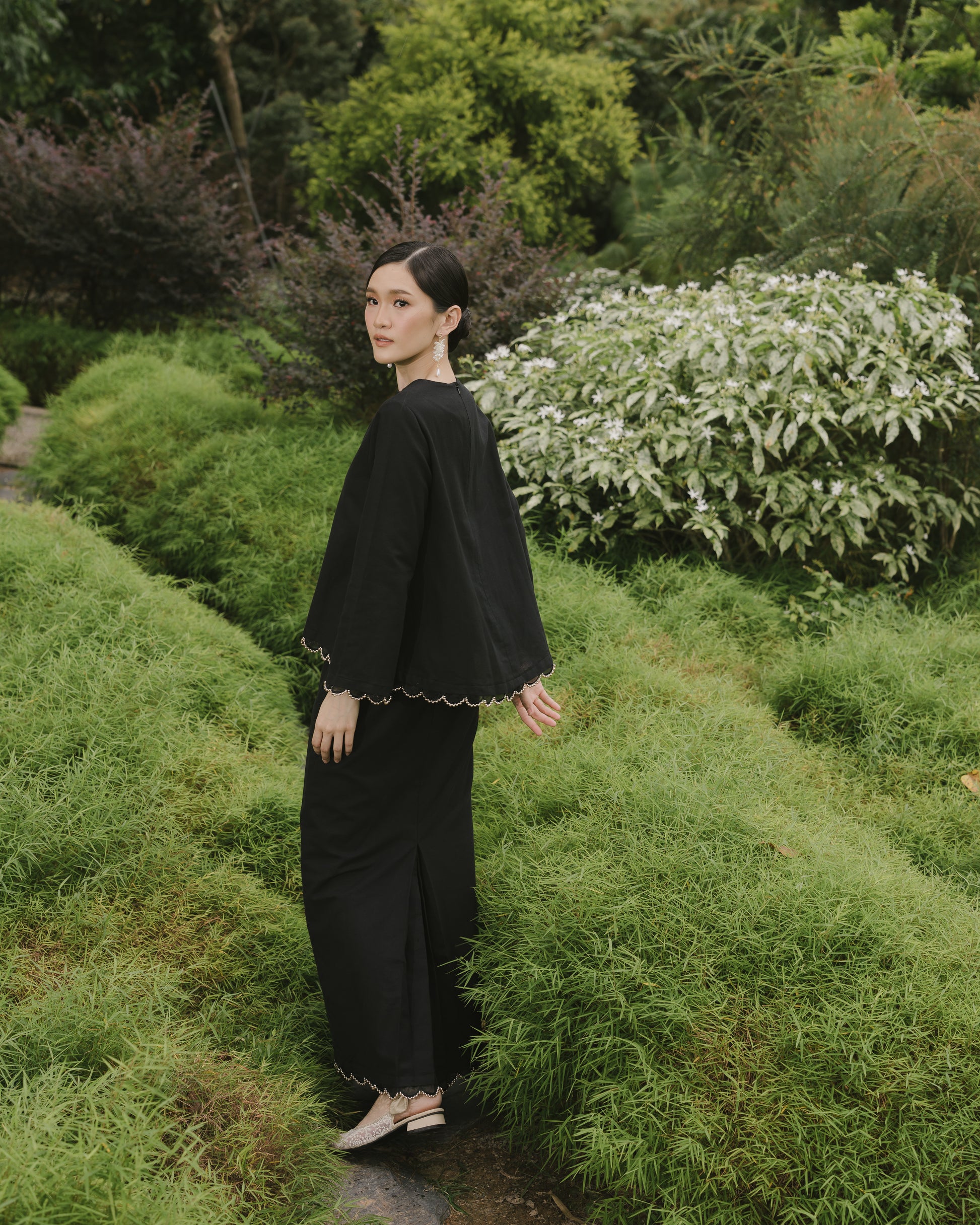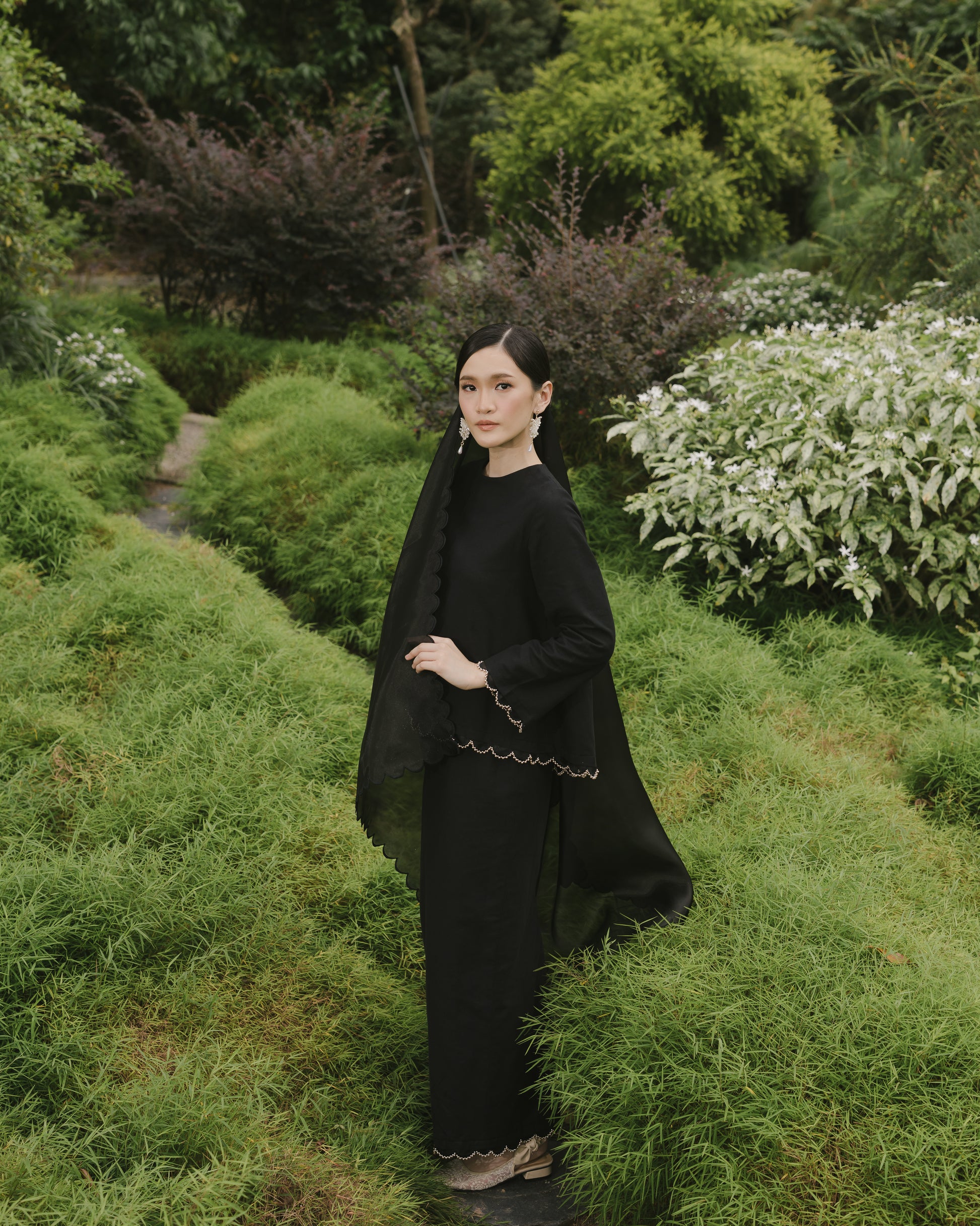Meet the Lisa Kurung in Noir—a treasured silhouette reimagined with beaded scallop hems. This beloved design from our community now features delicate beadwork that adorns the edges with understated beauty. Each bead reflects a commitment to thoughtful detail and refined artistry. A timeless piece for those who appreciate the quiet elegance of evolving tradition.